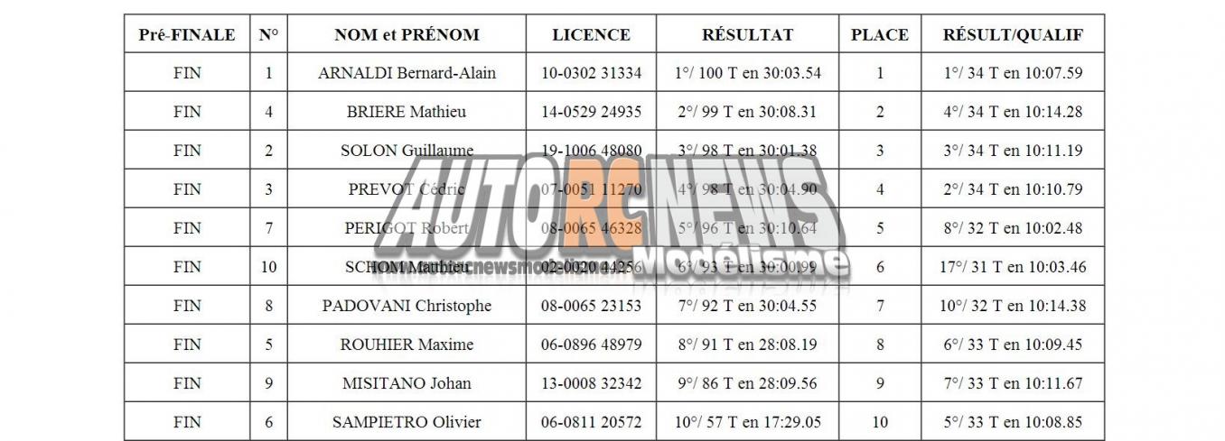 Dans la catégorie GT, Olivier Sampietro sera le premier pilote à devoir capituler après avoir couvert seulement 57 tours de piste ! Bernard-Alain Arnaldi règnera en maître sur cette finale avec à ses côtés un Mathieu Brière toujours très incisif en cette fin de saison. Les deux hommes terminant respectivement en 100 tours 30.03.54 et 99 tours 30.08.31. Derrière, la bagarre pour le leadership aura laissé deux autres pilotes se disputer la troisième place du podium en les personnes de Guillaume Solon et de Cédric Prévot. Les deux hommes s'étant livrés à un chassé-croisé permanent au cours des 30 minutes de course. Pour trois petites secondes de mieux, le Breton Guillaume Solon obtient finalement l'avantage sur l'Alsacien Cédric Prévot, avec des temps respectifs réalisés en 98 tours en 30.01.38 et en 98 tours en 30.04.90. La meilleure performance des outsiders restera sans conteste réalisée par Robert Périgot. Pour la der de l'année, le pilote Clermontois de l'Armca parvient à hisser sa Genius en 5ème position au nez et à la barbe de Matthieu Schom et de vieux limiers à l'expérience reconnue comme Christophe Padovani. Avec un 96 tours en 30.10.64, Robert Perigot Junior colle ainsi 3 tours dans la vue à Matthieu Schom et encore un de plus à Padovani ! En queue de peloton, Maxime Rouhier devra quant à lui se contenter de la 8ème place juste devant Johan Misitano et Olivier Sampietro.
