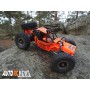 La voiture de Sylvain Cachard en orange fluo. Un mix de ponts Axial, avec arceau plastique de G-Made R1. Le tout équipé d'une transmission Tamiya CR 01 avec des essieux avant/arrière de fabrication perso.