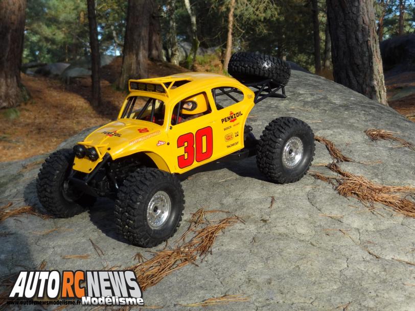 Sous cette coque de Cox se cache en réalité un Twin Hammer Vaterra. Celui d'Olivier Mallardeau avec sa carrosserie de Sand Scorcher Tamiya. Une auto chaussée de pneus Pitbull Racing.
