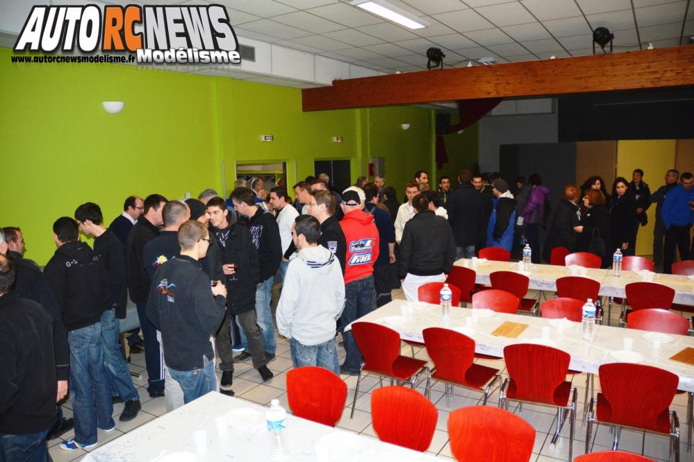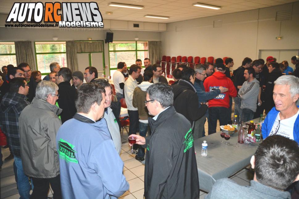 Les choses sérieuses vont commencer et se précipiter. Arrivée de Richard Colardelle du staff Avio et Tiger (l'importateur qui distribue le Blitz HPI en France et co-organisateur de cette endurance). Arrivée suivie par Camille et Sylvie Klos, les chronométreurs officiels de la course qui vont se relayer pour assurer la partie comptage 24 heures durant. Sans eux, rien de possible, plus de course ! A choyer donc. Et enfin, ceux que tout le monde attendait : les pilotes et leurs mécanos qui déferlent à tout va dans les stands en repérant le numéro de table qui leur a préalablement été attribué. Dix équipages venant des quatre coins de France sont présents en tout. Un chiffre en régression par rapport à l'an passé. L'essentiel tenant néanmoins au fait que toutes les équipes potentiellement éligibles au podium se trouvent sur place. De celle du Team Savoie Modélisme victorieuse en 2014 aux outsiders comme celle du team FGHC, du Team Moustached ou du Team Car Besançon. Bref, que du beau monde prêt à en découdre d'ici quelques heures. Dès leur arrivée, les équipes subiront un premier contrôle technique et viendront récupérer le pack de huit moteurs brushed 15 tours qui leur a été attribué par l'inscription. Les moteurs étant fournis à tous les pilotes par l'importateur Avio et Tiger pour éviter toute controverse de la part des pilotes. Les accus restant pour leur part libres au niveau de la marque, limités à 5300 mA en Ampérage, mais libres également au niveau du nombre de C qui symbolise le taux de décharge. Après une phase d'observation et une présentation rapide du déroulement de la course et des consignes, les pilotes seront conviés à effectuer des essais libres afin de se familiariser avec le tracé. L'approche des douze coups de midi les amenant ensuite à rejoindre la salle de réception du gymnase pour déguster l'apéritif de bienvenue à base de Kir que leur avait réservé le club. L'occasion pour le Maire de la commune de réaffirmer son soutien au club et à ce genre de manifestations impliquant le sport mécanique d'équipe. S'en suivra un bon repas mitonné aux petits soins par Myriam et toute son équipe, avec en point d'orgue, le fameux boeuf Bourguignon sans qui la région de la côte d'Or ne serait pas ce qu'elle est !