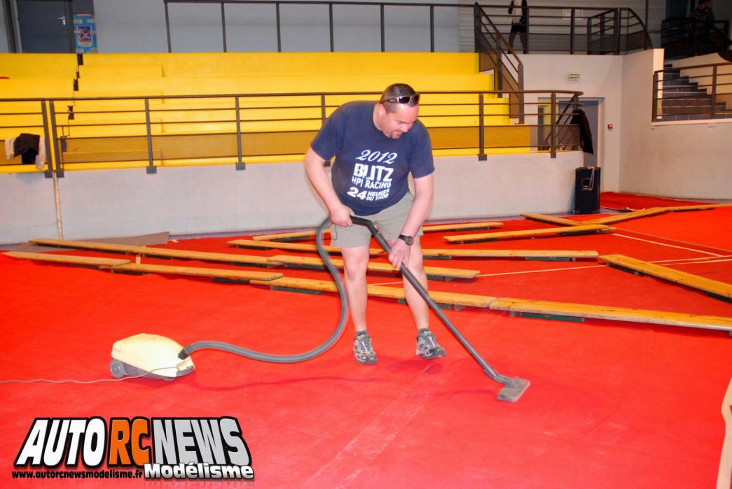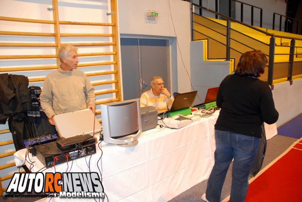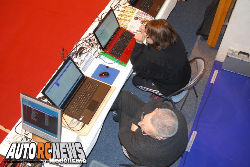 Dans l'ordre chronologique, les choses sérieuses ont commencé le vendredi, un jour avant la course, par la fastidieuse mise en place du circuit. Une tâche à laquelle seront assignés pas mal de bénévoles dont les membres du club MCT aidés de quelques pilotes dont la liste serait trop longue à vous énumérer ici. A coup de moquette, scotch, cutter, vibreurs et d'huile de coude, ces derniers auront concocté une piste somme toute voisine de celle des deux précédentes éditions, mais présentant quand même quelques variantes plus techniques au niveau du tracé. En arrière plan, on s'organise aussi pour mettre sur pied la buvette et la partie restauration indispensable sur ce type de manifestation. Puis la partie chronométrage qui sera régie par deux orfèvres en la matière, j'ai nommé : Camille et Sylvie Klos. Ces deux là ayant également rempilé pour une 3ème saison ! Pour la petite histoire, sachez que pas moins de trois ordinateurs seront déployés pour assurer le comptage durant toute la course et que nos deux comparses se relayeront à tour de rôle pour assurer derrière les écrans. Un sacré challenge !
