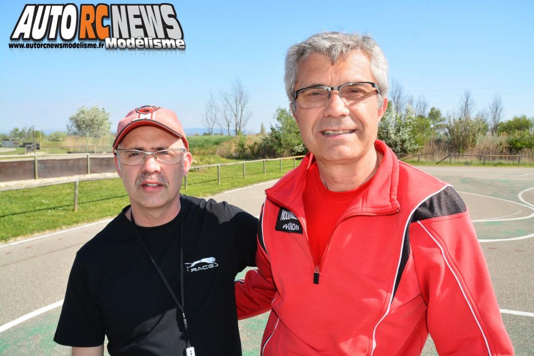 Fred Lapeyre (à gauche), l'initiateur des courses de motos R/C en France était présent en tant qu'officiel de la FFVRC et également en tant que compétiteur en catégorie Stock Bike. Il apparaît ici au côté d'Eric Nougier, le créateur du circuit Jean Nougier de Monteux.