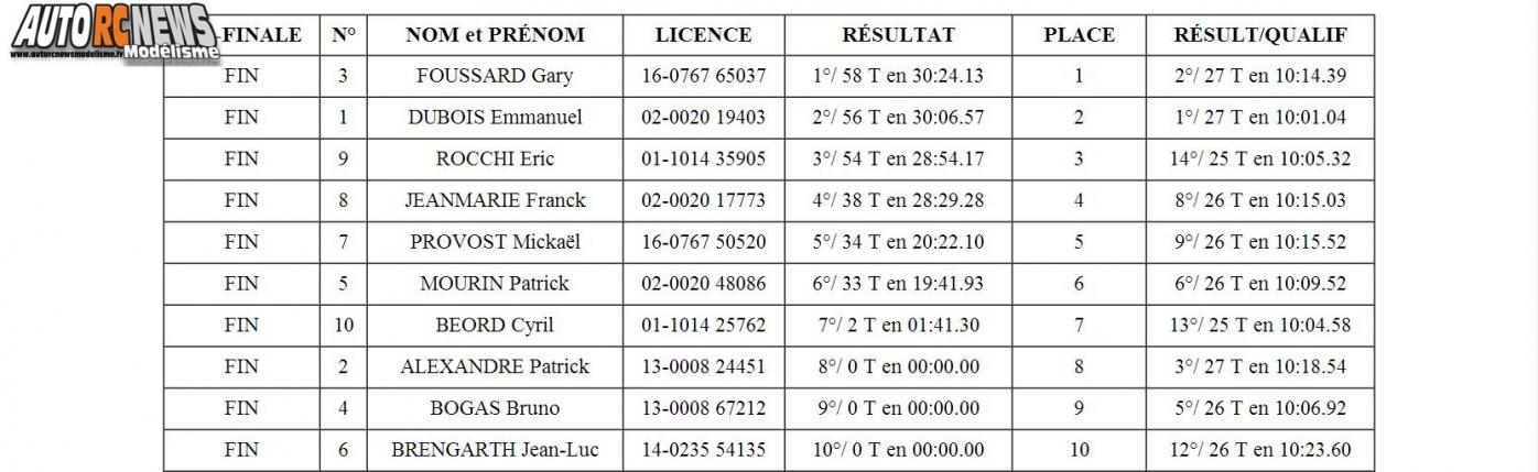 En catégorie Elite, nous signalerons l'absence de Robert Périgot sur cette finale. Le malheureux s'étant fait casser une chape supérieure de triangulation dans sa demi finale alors que sa qualification lui semblait acquise ! Nous assisterons sinon à un retour de Bernard-Alain Arnaldi revenu à son meilleur niveau. Même si l'on se doit de signaler les défections de Mathieu Brière, celle de Cédric Prévot ou encore celle de Guillaume Solon, sans qui cette finale aurait été manifestement plus animée. Guillaume Solon et Cédric Prévot n'ayant carrément pas pris le départ en raison des conditions climatiques pluvieuses. Qu'à cela ne tienne, la victoire ne sera pas pour autant facilement acquise pour Bernard-Alain Arnaldi. Celui-ci ayant dû batailler ferme au prix de belles passes d'armes avec Maxime Rouhier pour conserver le leadership. Bernard-Alain Arnaldi qui fera quand même étalage de tout son savoir faire en matière de pilotage et qui finira par remporter cette course devant Maxime Rouhier donc, avec un tour d'avance, puis Romain Lacroix à deux tours. Cette finale fera également la part belle aux habituels outsiders, avec notamment Alexandre Schueller qui s'empare de la 4ème place, puis Loïc Duquesne de la suivante. Mathieu Brière visiblement pas à sa place devra quant à lui se contenter de la 6ème place. Suivront dans l'ordre Maxence Couture-Fritz, puis Cédric Prévot, Guillaume Solon et Lionel Joly.