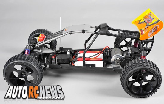 Grâce à un subtil réaménagement de son châssis, le TT 1/5ème accueille désormais un moteur brushless FG " E Power " de 730 kv accouplé à un contrôleur programmable de 150 Ampères. La programmation du contrôleur s'effectuant ici à l'aide d'une télécommande et/ou d'une carte de programmation.