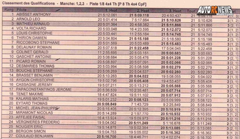 En catégorie classique tout d'abord, signalons que le champion de France sortant Stéphan Nicaud restera immobilisé au stade des demies par la faute d'une durite entaillée. En finale, bon nombre de pilotes seront en proie à des soucis. A commencer par Cyril Fages qui devra s'arrêter après seulement 12 minutes de course. Il sera bientôt imité par Serge Christiany (le plus rapide en course avec un 17.035 au tour), en proie quant à lui à des problèmes radio. Julien Mathieu, pourtant très rapide, sera lui aussi quelque peu freiné dans ses élans. Même motif, même punition en ce qui concerne le pole man Jacky Mouton, bien que celui-ci ait signé