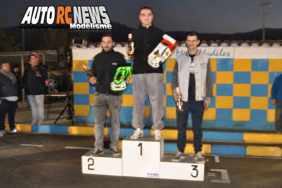 Podium Piste 1/8 Brushless : victoire de David Wintzerith devant Pierre Santoriello et Stéphane Bouey.