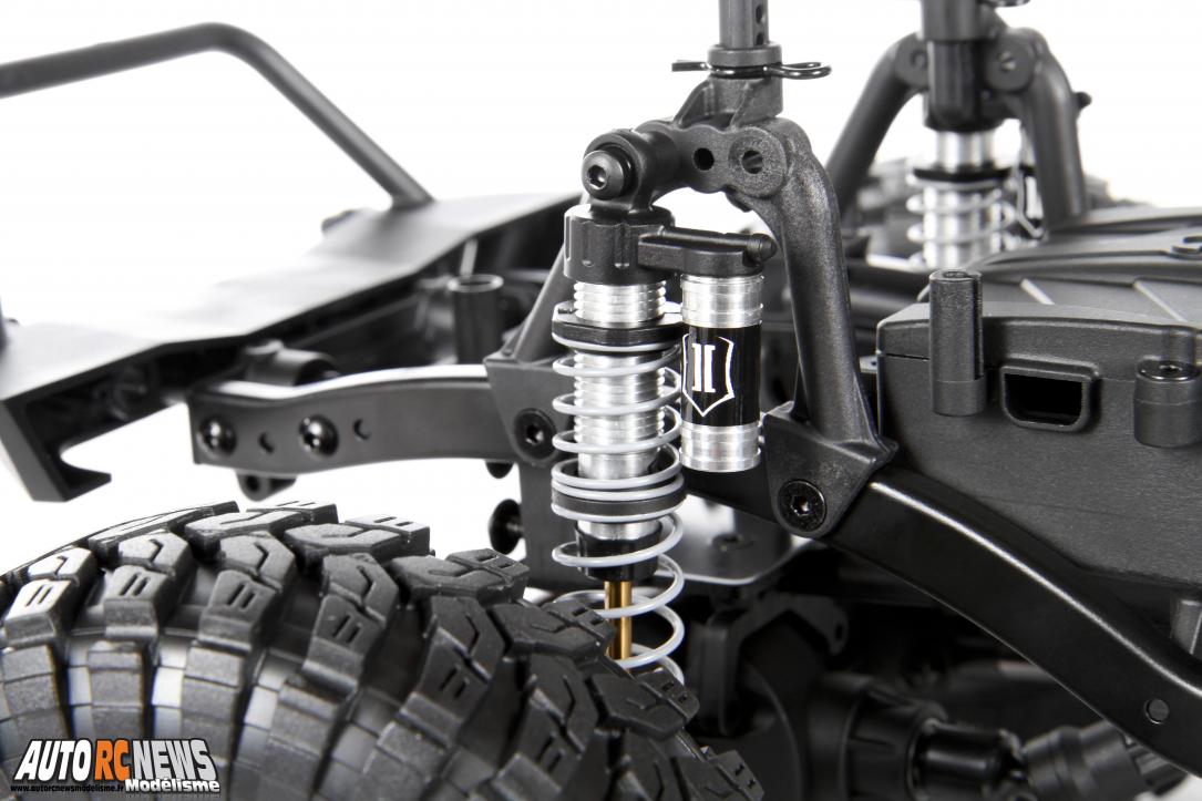 Livrée en kit à monter, cette nouvelle Jeep Wrangler Rubicon à l'échelle 1/10ème signée Axial présente l'avantage d'être fournie avec une palette de pièces habituellement disponibles en option. A ce titre, l'auto reçoit notamment de superbes amortisseurs métalliques avec un réserve d'huile additionnelle factice. Des modèles pourvus de tiges en nitride de titane qui disposent d'un système à double ressort. La géométrie arrière s'appuyant pour sa part sur une suspension 4-Link optimisée pour le franchissement et la maniabilité du châssis.