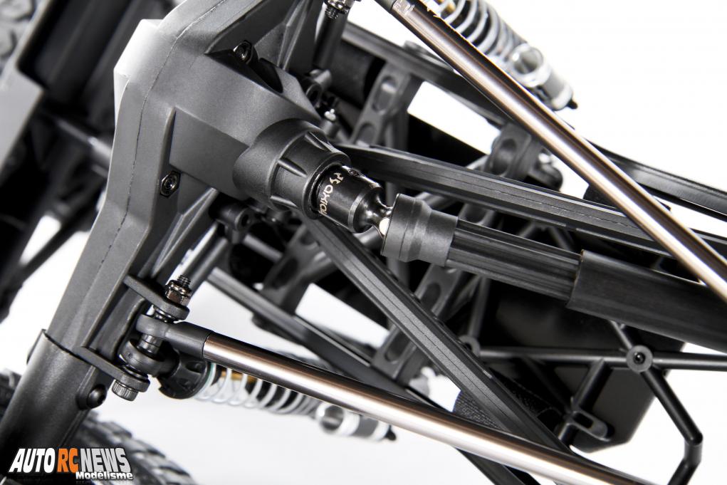 L'auto reçoit des cardans coulissants articulés sur toute sa transmission, ainsi que des pneus Maxxis Trépador positionnés sur des jantes " Walker Racing Evans " conçues sous licence et rattachées à des hexagones de 12 mm. La transmission s'est également attelée à placer la fixation moteur au plus bas pour favoriser le centre de gravité. Elle propose deux modes de fonctionnement avec un pont court spécial franchissement et un pont long. L'ensemble demeurant sous la bienveillance d'un slipper réglable protégé sous carter. Les liaisons au sol de l'auto reposent par ailleurs sur un châssis conique qui améliore la garde au sol et sa faculté à pouvoir s'articuler sur les obstacles. Esthétiquement, l'auto a fourbi ses armes. La plateforme peut recevoir toit en polycabonate qui viendra se fixer au dessus de son arceau de protection. Des petits détails croustillants se sont invités à bord, comme des rétroviseurs, des élargisseurs d'ailes et un tableau de bord plus vrai que nature.