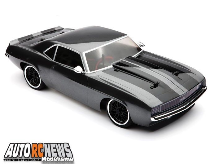 On la croirait tout droit échappée d'un film à la Bullit avec Steve Mac Queen à ses commandes. Elle, c'est la nouvelle Chevrolet Camaro RS 1969 revisitée par Vaterra qui revêt des allures de " muscle cars " sous cette robe à la fois agressive et surbaissée. Dotée d'une carrosserie sous licence Général Motors, cette électrique quatre roues motrices nous replonge dans le contexte des Seventies. Sa mécanique pré montée est livrée avec une électronique étanche de marque Spektrum, et elle reçoit un moteur 540 à charbons Dynamite 15 tours qui sera alimenté par un accu 7,2 volts Ni-Mh de 1800 mA. L'auto est très légère. Elle ne pèse que 1700 grammes et des options sont d'ores et déjà prévues pour pouvoir l'upgrader comme il se doit. Relevons au sein de ces dernières, la possibilité d'équiper le châssis d'un combo Dyamite brushless qui fait appel à un moteur 4 pôles de 3300 Kv et à un accu Li-Po 2S de 7,4 volts de 5200 mA et 50C pour donner un bon coup de pied aux fesses aux performances ! Possibilité aussi de remplacer le save servo et le cardan central en nylon par des modèles en aluminium, puis d'adopter pour de vrais disques de freins avec étriers métalliques. Des cardans de transmission avant/arrière en acier, des amortisseurs et des étriers avant/arrière en alu sont également proposés pour flatter l'agrément de conduite.