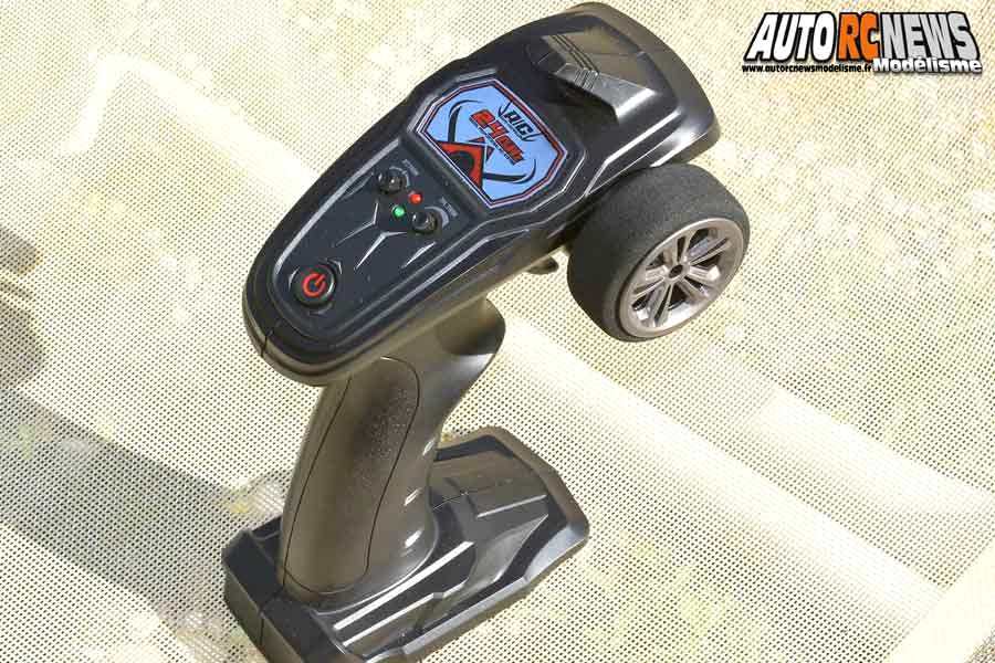 Notre petit bolide se met en route très facilement. Après avoir logé 3 piles type LR6 dans l'émetteur. Il suffit de mettre sous tension celui-ci en premier, puis de presser sur le petit bouton interrupteur qui est situé sur le bord droit du châssis pour mettre en branle toute cette petite mécanique de précision. En piste, le Spirit 1/16 accélère gentiment et il atteint assez rapidement aussi sa vitesse finale annoncée par le fabricant pour un peu plus de 35 km/heure. La voiture réagit promptement aux réactions du pilote et aux diverses corrections sur le volant de l'émetteur. En suspension, elle n'apparaît pas si ridicule en rapport de sa petite échelle. Les amortisseurs parvenant à conserver les roues scotchées au sol malgré le relief quelque peu chaotique sur lequel nous évoluons. Le pilotage demande certes une peu de doigté à l'approche de la vitesse maxi de l'engin, car le châssis dispose d'un empattement très court. Mais dans l'ensemble, tout se passe dans le meilleurs de mondes à bord. Pour conclure, voilà une auto qui n'est certes pas la voiture de l'année 2019, mais un sympathique petit châssis qui fait bien le job est qui se situe surtout à des années lumière d'une voiture de supermarché !! Alors, au prix ou elle est proposée, un bon conseil, courez vite dans une vraie boutique de modélisme et de voiture RC pour l'acquérir et fuyez les produits très bas de gamme que l'on vous vend en supermarché. Pour quelques euros de plus seulement, vous avez là une vraie voiture radiocommandée. Et croyez-moi, ça change tout, mais vraiment tout lorsque vous pilotez !