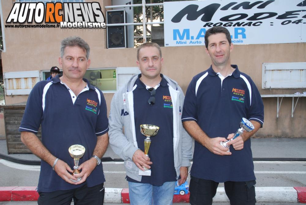 Podium Rallygame Electrique : victoire de Thierry Cesmat devant Laurent Lecollier et Francl Monnot.