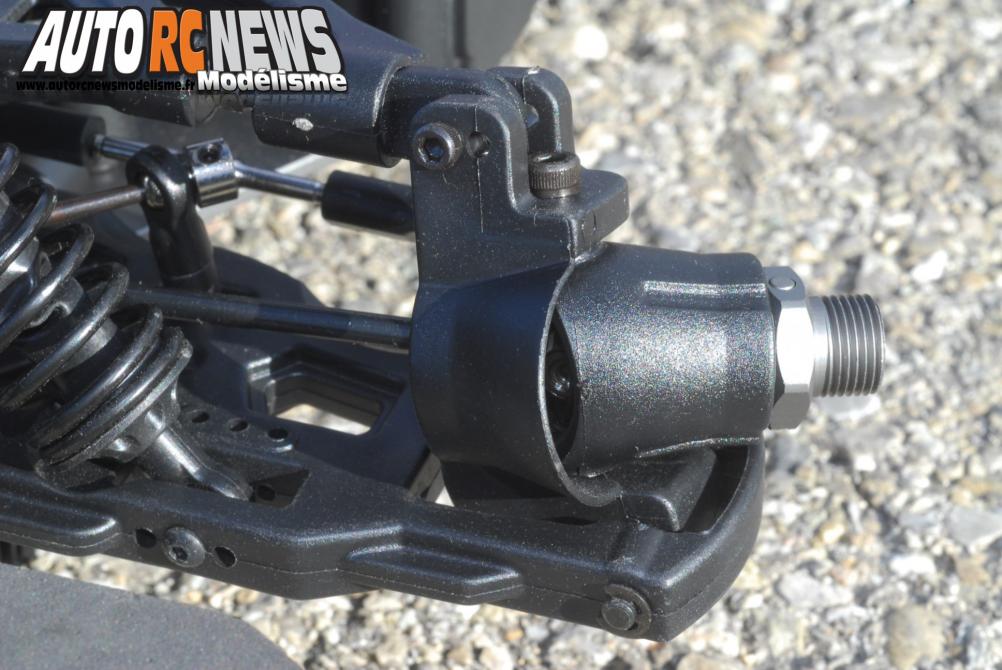 Celui-ci met en avant une épure à double triangulation impliquant des bras inférieurs bien rigides et renforcés par des croisillons de 11,5 centimètres de longueur en tout. Les triangles de la partie haute disposent de pas inversés pour régler le carrossage des roues. Egalement d'un présumé réglage de châsse accessible au travers de petites cales que l'on perçoit à l'avant des bras. Un réglage qui est en réalité fictif puisque l'auto ne possède pas de porte fusées montés sur rotules, mais des porte fusées rapportés à des étriers (l'angle ne pouvant pas varier dans ce cas). Hormis cela, la cellule reçoit une barre antiroulis de 2,5 mm, un save servo sur roulements réglable en dureté, tandis que le réglage d'Ackerman trouvera deux variantes au choix pour donner une auto plus ou moins vive en entrée de courbe par l'intermédiaire de la plaque qui relie le save servo à son renvoi d'angle. A noter aussi que cette cellule est la mieux lotie du point de vue de l'équipement. Des cales en aluminium anodisé servant de supports aux bras inférieurs de la triangulation. La cellule arrière diffère sensiblement par ses tirants réglables qui viennent occuper la partie supérieure, tandis que le diamètre de sa barre antiroulis est également fixé à 2,5 mm. Elle met également en évidence un immense support de carrosserie réglable en hauteur.