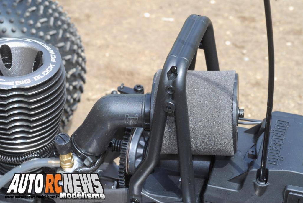 Quel cadeau HPI pouvait-il encore bien apporter à cette version déjà armée jusqu’aux dents. La surenchère allait-elle être possible ? Premier élément de réponse avec ce qui va suivre. Tout étant devenu plus « giga », voire impressionnant à bord de cette auto, il ne restait plus à ce stade qu’à revoir encore le moteur. Ce qui sera chose faite, et de la meilleure manière qui soit. Pour enterrer définitivement le clou et relancer le genre, toujours en précurseur, HPI a mis son bureau d’étude sur le coup pour nous sortir un carter entièrement innovant de 5,9 cm3 ! Trois transferts seulement au niveau de la chemise (ABC s’il vous plaît !), mais un vilebrequin qui passe à 14 mm et un carburateur hyper perfectionné disposant de deux vis pour ajuster le bas régime, sans oublier aussi un venturi de 9,5 mm. Des chiffres qui parlent d’eux-mêmes ! Ajoutons à cela la présence d’une culasse haute de refroidissement grosse comme un œuf, puis d’un vrai résonateur en aluminium, et l’on n’est sans doute pas loin de la perfection. Cerise sur le gâteau, le moteur Big Block 5.9 est équipé du système roto start. Son démarrage saura ainsi se mettre à la portée de tous.