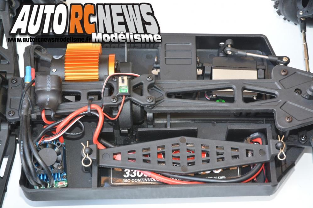 Nous apercevons ici la version brushless de ce TT qui se caractérise par un empattement généreux et des voies hyper larges, comme sur une 1/8ème.