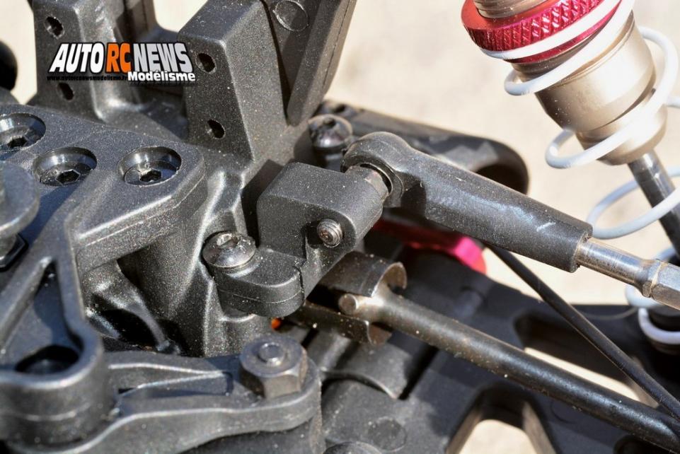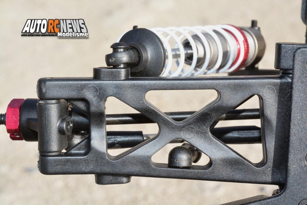 Train avant La géométrie d'ensemble exhibe des bras inférieurs dotés de croisillons de renfort bien proportionnés par rapport à l'échelle du véhicule. Ils sont associé à des tirants sur rotules montés sur pas inversés et à des étriers fixes non réglables reliés à des porte fusées pivotants. La cellule est équipée d'un save servo réglable en dureté mais invariable du côté de l'épure d'Ackerman. En revanche, elle reçoit une barre antiroulis réglable d'1,5 mm tout à fait bienvenue pour une voiture de loisir. Le carter principal en deux parties accueille un différentiel à pignons coniques à deux satellites et des cardans de transmission CVD. L'ensemble étant complété par un support assez haut en plastique injecté qui attribue quatre ancrages pour retenir les amortisseurs.