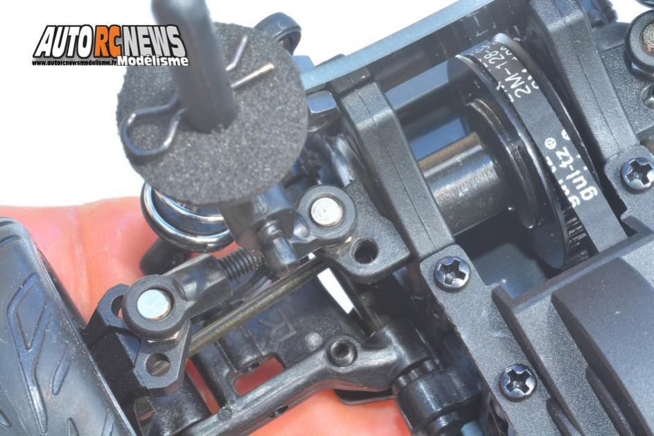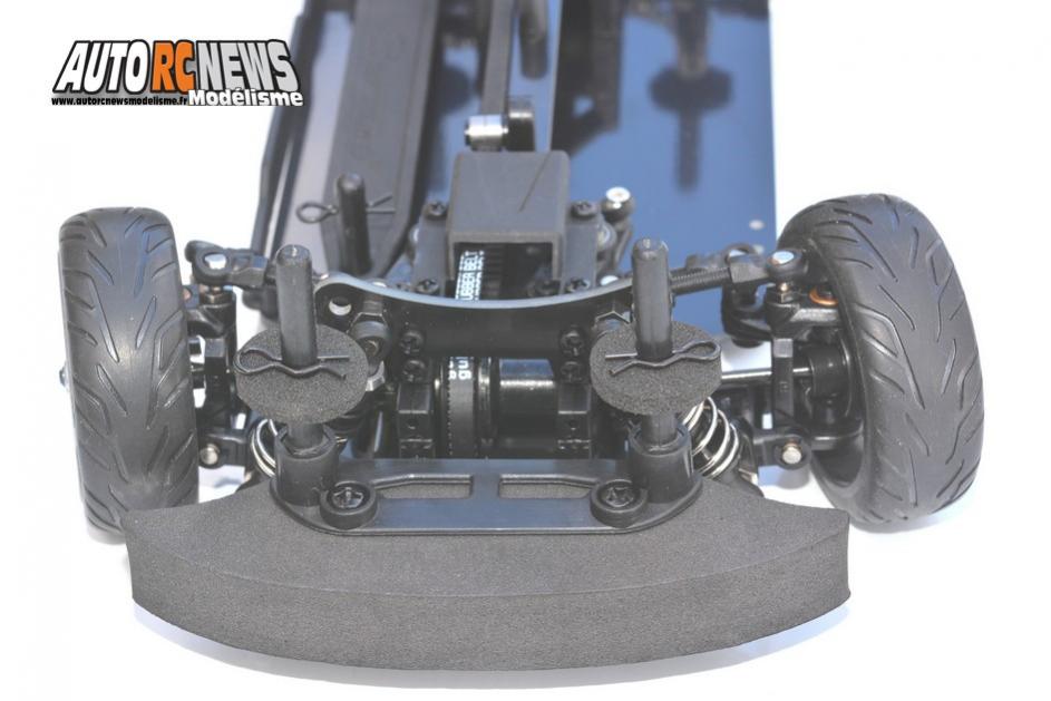 Cette auto s'appuie sur un châssis en fibre époxy teinté qui lui confère un empattement de 186 millimètres et une largeur de voie portée à 135 mm. Elle est entièrement montée sur roulements à billes et se fait fort de posséder une transmission centrale par courroie. Une courroie qui bénéficie à l'avant d'un petit tendeur monté sur double roulement à billes, et d'un slipper réglable sur la partie centrale/arrière. A l'avant, la cellule à ciel ouvert seulement constituée de deux paliers arbore des bras triangulés sur la partie inférieure, et des tirants sur rotules montés avec des biellettes à pas filetés. Ces bras délivrent deux positions pour retenir les amortisseurs et sont munis de vis pour pouvoir ajuster la garde au sol. La cellule se distingue aussi par son absence de barre stabilisatrice puis part sa direction qui associe des porte fusées à des étriers. Des cardans de transmission en acier à boules goupillées ont été installés ici pour finaliser les liaisons de roues. Surtout, la cellule reçoit un différentiel à billes réglable. On accèdera au réglage en question par l'une des noix de cardans, en introduisant une petite clé Allen. La règle qui fait foi en la matière étant que pour durcir le différentiel, il suffit de visser la vis concernée. Le train avant se complète d'un support de suspension en fibres époxy de 2 millimètres d'épaisseur, disposant de deux réglages d'inclinaison, puis d'un save servo monté sur roulements à billes pourvu de deux ancrages pour régler l'Ackerman.