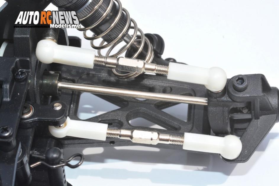 La triangulation du train avant reste associée à des tirants montés sur rotules pour le guidage des roues. Ces derniers sont équipés de biellettes à pas inversés et de chapes de couleur blanche distinctive. L'épure de direction possède un save servo à renvoi d'angle non réglable du point de vue de l'Ackerman. En revanche, celui-ci est réglable en dureté et il est monté sur des roulements à billes, tout comme les fusées de direction du reste. En rapport avec l'échelle du véhicule, la suspension intègre des amortisseurs hydrauliques haut de gamme montés sur rotules et pourvus chacun de corps métalliques en aluminium anodisé. Ils comportent des molettes réglables et leur inclinaison pourra varier en fonction de l'ancrage retenu sur leur support en époxy et au niveau des triangles. Trois fixations étant disponibles par le biais du support et deux d'entre-elles par l'intermédiaire des bras de suspension. Enfin, cet essieu reçoit un différentiel à billes réglable en dureté.