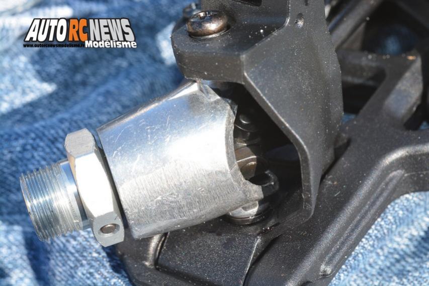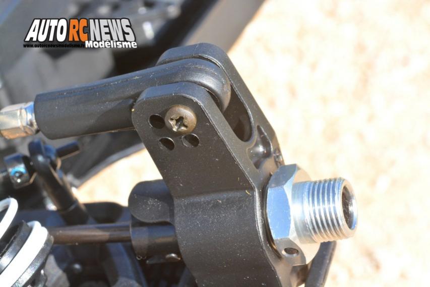 Celui-ci est tout aussi complet. La cellule comporte une barre antiroulis réglable de 2,8 mm de diamètre et un support amortisseurs pourvu de 4 réglages de prises de carrossage à l'enfoncement. L'angle de pincement demeure en revanche invariable. Il est fixé à 3 degrés par la cale qui vient siéger en porte à faux du châssis. Le train arrière est structuré avec des cardans droits à boules goupillées. Les porte fusées qui sont situés aux extrémités des bras de suspension comportent 4 ancrages pour faire évoluer la prise de carrossage à l'enfoncement.