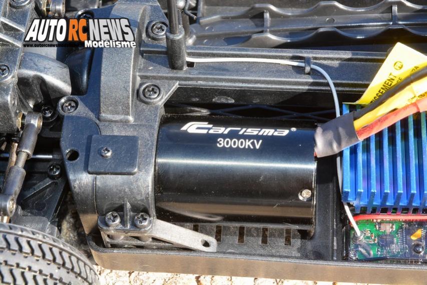 Ce modèle est équipé d'un moteur brushless Carisma de 3000 Kv et d'un contrôleur électronique de 60 Ampères qui gère toute les fonctions de façon automatique. Autrement dit, vous n'avez rien à programmer au sortie de la boîte pour que votre auto accélère avec vigueur ou encore freine, ou qu'elle s'échappe en marche arrière lorsque vous solliciterez à cet effet la gâchette de l'émetteur. Le moteur est installé sur un support réglable qui permet d'ajuster l'entre dents entre la couronne principale nylon et le pignon de sortie d'arbre. Le contrôleur reçoit un petit radiateur anodisé de refroidissement et un condensateur. Carisma à d'autre part équipé son châssis d'un servo éponyme standard qui développe environ 3 kilos de couple et qui possède une pignonnerie plastique. Celui-ci est installé en position couchée et monté à bord en compagnie d'un palonnier articulé qui fera office de save servo pour protéger les dents des engrenages en cas de choc. Enfin sachez que le contrôleur est relié d'origine à une prise de type XT60 peu courante sur les modèles radiocommandés. Pour pouvoir monter à bord tous les modèles d'accus Li-Po du commerce, dont le Kryton préconisé par le fabricant, Carisma livre un petit adaptateur que vous devrez raccorder pour transformer la prise de série en une prise Dean classique.