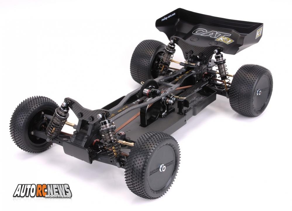 Ce nouveau châssis très exclusif et principalement axé vers la course met en avant une nouvelle transmission inédite parée de deux courroies centrales à friction réduite. Celles-ci seront calées de part et d'autre du châssis par l'intermédiaire d'un imposant support équipé de tendeurs réglables réalisé en aluminium CNC. L'architecture de ce nouveau buggy repose sinon sur un châssis en aluminium de 2 mm d'épaisseur. Quelques indiscrétions laissent deviner la présence d'une transmission entièrement équipée de roulements à billes flasqués de haute précision, ainsi qu'un nouveau système de direction qui revient en première ligne avec un save servo à renvoi d'angle directement montés à même le châssis et revus et corrigés concernant l'Ackerman. Equipé de pas inversés en titane et de supports amortisseurs en carbone de 4 mm d'épaisseur, le Cat K1 propose également des bras de suspension revus au niveau de la flexibilité et un système d'étriers et porte fusées avant entièrement revu lui aussi pour apporter davantage de constance et de précision dans les virages. La suspension de l'engin s'est dotée des meilleurs atouts en s'adjugeant les services d'amortisseurs big bore à la finition alu usinée. Ces derniers disposent de plusieurs jeux de pistons coniques repérables à leur coloris pour améliorer le comportement du châssis sur les bosses. Dans un souci de préserver le rapport poids/puissance, la transmission voit apparaître des arbres en nitrure de titane. Et pour un fonctionnement optimisé, les cellules avant et arrière reçoivent deux différentiels à billes à glissement pourvus de billes renforcées conçues avec du nitrure de silicone.