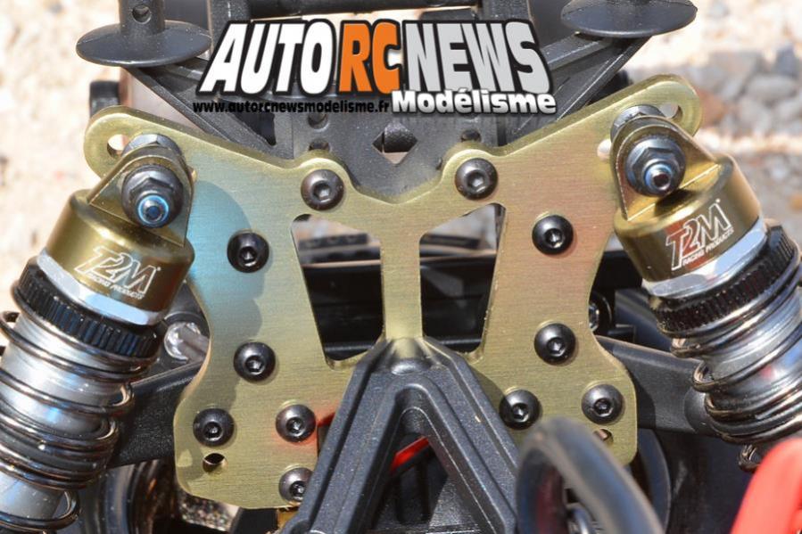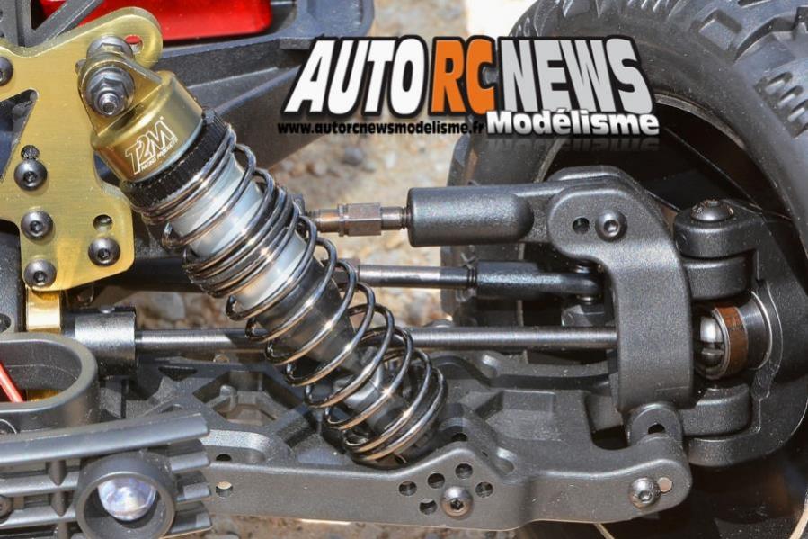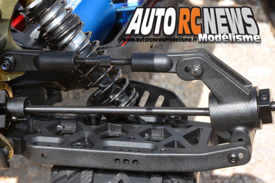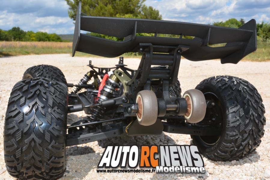 Pour se remettre le pied à l'étrier au sein de l'univers des grosses roue comme on a coutume à les appeler, le géant Français T2M nous propose donc sa dernière arme absolue dans ce domaine qui se nomme le Pirate Furious ! Un colosse aux pieds de caoutchouc dont le caractère extravagant de la conception laisse augurer du meilleur en utilisation. Le carton dans lequel nous réceptionnons l'engin est à la mesure des dimensions de celui-ci. Soit précisément près de 53 centimètres de long pour 38 centimètres de large et 21 centimètres de haut. Le tout avec un empattement modulable de 33 centimètres. Ca calme net ! Une fois en mains, le truggy se révèle tout aussi impressionnant et massif que son carton. Ses énormes roues de 14 centimètres de diamètre montées sur des hexagones de 17mm donnant le sentiment qu'aucun obstacle ne va pouvoir lui résister. Quelques précisions s'imposent toutefois à ce stade. T2M fournit cette auto entièrement pré assemblée. Ses concepteurs lui ont adjoint un nouvel émetteur T2M en 2,4 Ghz. Celui-ci est frappé de l'inscription " Pirate Furious " sur la façade du boîtier. Il possède un volant décentré et sera à équiper de quatre piles de type LR6 d'1,5 volt chacune ou d'accus correspondants. D'autre part, ce truggy fait abstraction de l'accu de propulsion. Pour pouvoir tirer toute la quintessence de ses liaisons au sol, son distributeur recommande d'opter d'entrée de jeu pour un accu " sérieux ". Autrement dit, un Li-Po 2S de 4500 mA minimum d'Ampérage ou pour un accu Li-Po 3S ayant un minimum de 4000 mA d'Ampérage. Pour notre part, le modèle d'essai qui nous a été confié sera équipé d'un pack Ansmann 2S de 6000mA en 50C. De quoi avoir quelques watts en réserve pour faire grimper l'engin aux arbres. Où plutôt pour effectuer des roues arrière à l'accélération ! Car c'est l'une des autres particularités de cet engin. Celui-ci est livré avec une " Wheelie Bar " comme on l'appelle. Il s'agit d'une roue arrière, où plutôt deux, qui viennent se positionner à l'arrière de la cellule postérieure. Elles permettent d'entretenir et de prolonger des accélérations sur deux roues, juste pour le fun ! Ce tout terrain est également fourni sans chargeur. Nous vous conseillons d'opter à cet effet pour le chargeur équilibreur Wizard Box référence T1245 de chez T2M qui sera tout à fait adapté pour l'engin et son électronique. La dernière particularité du Furious viendra du fait que sa structure de série est équipée de phares à led avant et arrière. Des phares bleus officiant à l'avant et des phares rouges sur la partie arrière. Seule ombre au tableau, impossible de les commander à distance depuis l'émetteur. Il faudra donc connecter entre-elles deux prises logées à proximité du récepteur pour les mettre en marche. Enfin, côté équipement, ce TT n'est pas en reste puisque T2M lui a attribué d'origine un servo efficace de 9 kilos de couple à la direction. Ce modèle possède des pignons métalliques et revendique le label " Waterproof ".