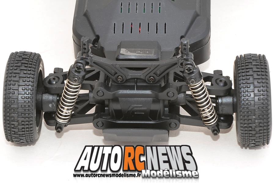 Comme le modèle précédent que nous vous avons présenté il y a quelque semaines sur notre site, cette GT24R possède une transmission 4 x 4 par cardans droits à boules goupillées. Ses carters de cellules accueillent 2 différentiels et un slipper central réglable qui permet d'agir sur la motricité. Le carter de protection qui renferme toute la mécanique centrale abrite un moteur brushless de 8000 Kv. Le tout étant alimenté par un accu Li-Po 1S de 3,7 volts. Celui-ci est livré avec une clé USB à raccorder à l'un des ports de votre ordinateur pour recharger la batterie. L'électronique du véhicule fait dabs le genre simpliste. Elle met en scène une plaque de circuits imprimés qui font office de récepteur et de contrôleur. On notera quand même la présence d'un véritable servo placé au ras du châssis ainsi que celle d'un condensateur. Malgré son gabarit lilliputien, la voiture possède quand même des amortisseurs réglables sur plusieurs positions. Le kit RTR se révélant complet, fourni avec une radio à volant Carisma CTX8000 et de ses 4 piles.