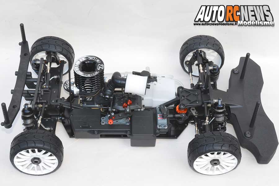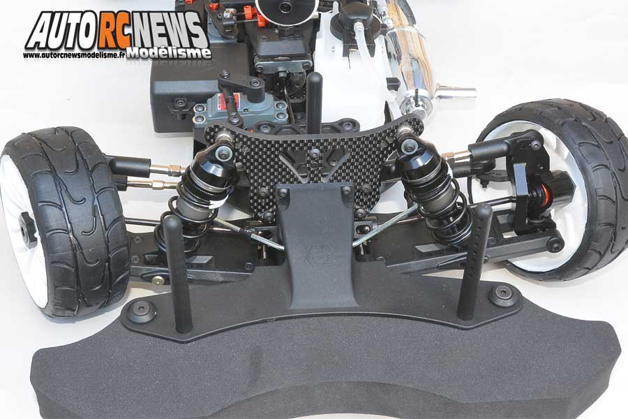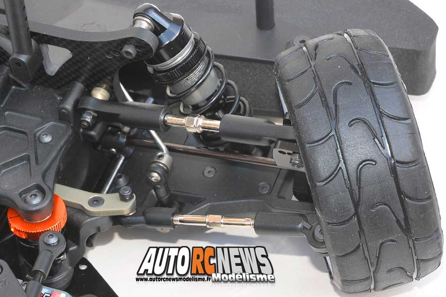 Il reprend des bras triangulés plein en nylon injecté chargés de graphite. Des bras qui comportent un cache rapporté et fixé par 5 vis pour masquer les croisillons de renfort. L'épure est associé à des tirants supérieurs sur rotules munis de biellettes à pas inversés, et à une barre antiroulis réglable de 2,6 mm de diamètre. Les triangles inférieurs sont fixés de part et d'autre de cales en aluminium anodisé pourvues d'inserts gradués. Ces derniers servant à modifier l'angle d'anti-plongée du châssis ou bien à agir sur le centre de roulis. Le train avant reste solidaire d'étriers en aluminium anodisé procurant 15 degrés de châsse. Ils sont gradués et numérotés pour ne pas se retrouver inversés lors du montage. Des fusées issues du même matériau se joignent à cet ensemble. Elles offrent 3 positions pour faire varier l'Ackerman. La cellule se pare encore d'un magnifique support amortisseurs en carbone de 5 mm d'épaisseur qui offre 5 inclinaisons diverses et 4 ajustement possibles au niveau de la prise de carrossage des roues. Le save servo est réglable. Sa molette de réglage occupe la partie haute du tube principal, pour un accès facile et rapide en cas de besoin. L'inventaire de la cellule se complète d'un énorme pare-chocs en mousse qui fait également office de support