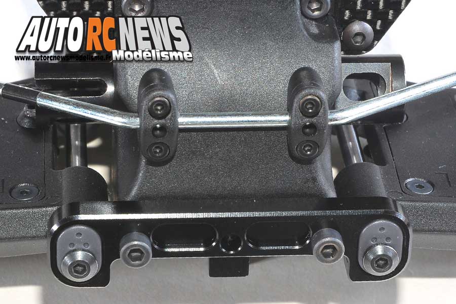 On retrouve globalement quelques similitudes de conception avec son homologue avant. A la différence toutefois que la barre antiroulis réglable passe à 3 mm au niveau du diamètre. Comme à l'avant également, des inserts gradués sont à votre disposition pour faire varier l'angle de pincement des roues, ou encore celui de l'anti-cabrage. L'empattement pouvant également faire partie des données d'origine que l'on peut modifier. Le réglage de prise de carrossage grimpe à 3 au niveau des porte fusées. Ces derniers sont métalliques. En revanche, le support amortisseurs carbone, toujours en 5 mm d'épaisseur campe sur ses positions, avec respectivement 5 et 4 fixations pour desservir le réglage de suspension et de la prise de carrossage des roues. Autre point en commun avec le train avant : un énorme support arrière en plastique injecté qui prend place sur la cellule pour supporter la carrosserie. A noter aussi la présence d'une petite plaque rectangulaire en inox bien vue qui vient se placer sous le châssis pour prolonger la durée de vie de ce dernier !