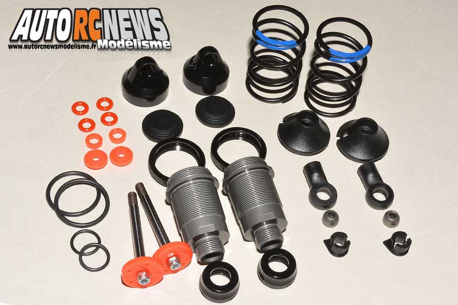 Notre RGT8 dispose d'amortisseurs big bore de 16 mm de diamètre à corps anodisés et filetés. Les deux paires d'amortisseurs sont identiques en longueur sur chaque essieu. Seuls les ressorts les différencient. L'essieu avant pouvant compter sur des ressorts plus durs de couleur blanche, et le train arrière sur des ressorts un peu plus souples au coloris bleu. Ces amortisseurs composent avec des tiges robustes de 4 mm et des pistons 6 ou 8 trous au choix. Plusieurs jeux étant livrés dans le set avec des pistons 6 et 8 trous de respectivement 1,2 1,3 et 1,4 mm. Et même 2 jeux de pistons vierges à percer pour ceux qui voudront se la jouer réglages perso ! De part et d'autre des triangles de suspension, ces amortisseurs pourront occuper deux fixations au choix pour agir sur la prise de roulis en courbe du châssis.