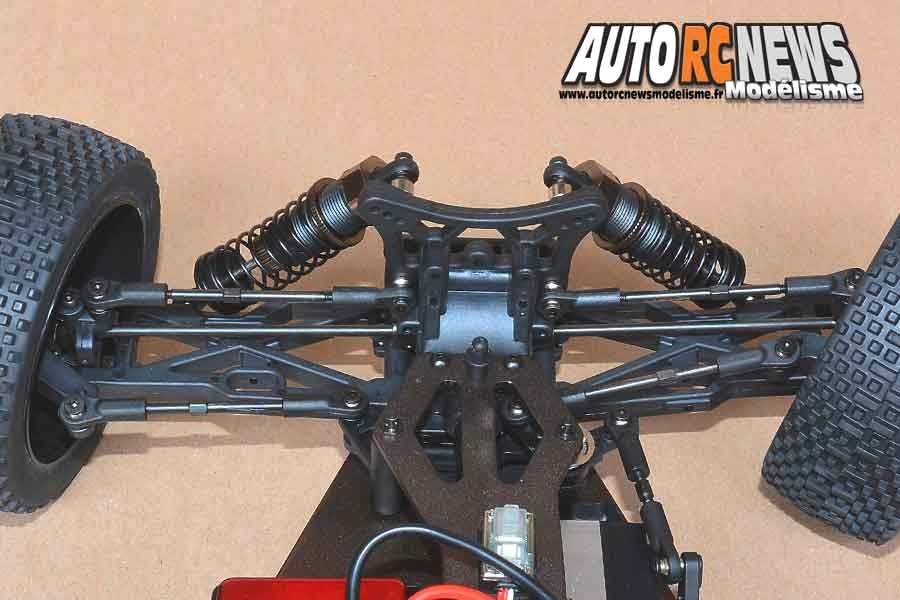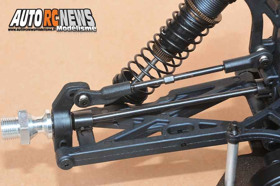 Il possède à son actif toute la rafale de biellettes à pas inversés nécessaires à une mise au point rapide de la géométrie de la cellule. Un différentiel à couple conique en alliage et des cardans de roues CVD viennent parachever la transmission aux roues. Cet essieu comporte sinon des bras triangulés de 9 centimètres de long reliés à des porte fusées montés sur étriers. Des modèles très typés 1/10ème de par leur gabarit. Les porte fusées intègrent 2 réglages d'Ackerman. Ce qui n'est pas le cas du save servo à renvoi d'angle dont les valeurs demeurent figées de boîte. La cellule ne possède pas de barre antiroulis. Elle est jonchée par un support amortisseurs en plastique injecté à 3 positions qui mesure 5 mm d'épaisseur. Des amortisseurs à corps filetés réglables par molettes venant compléter le tout.