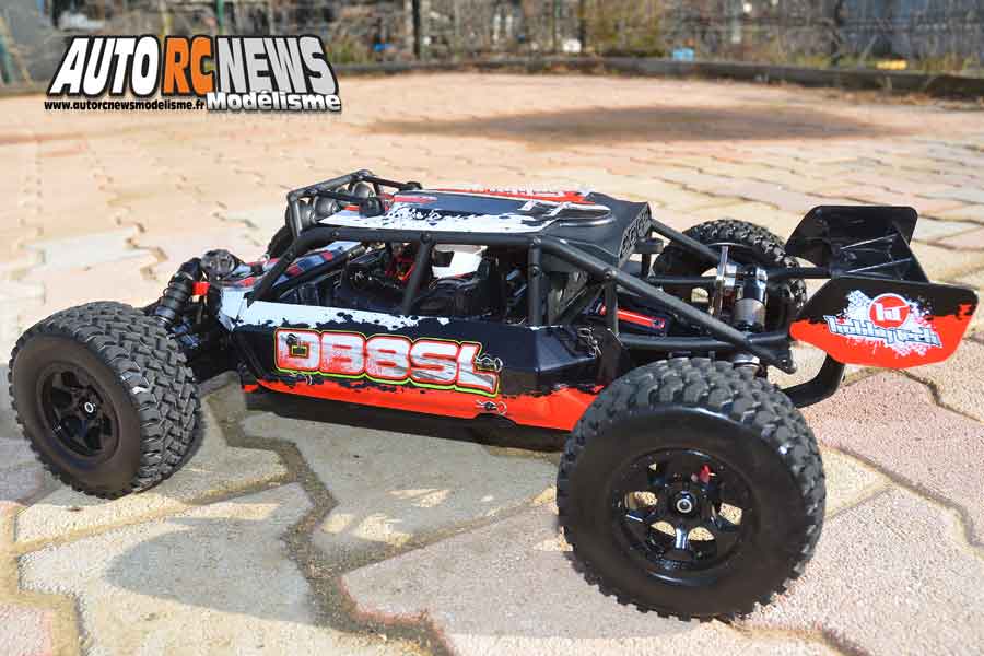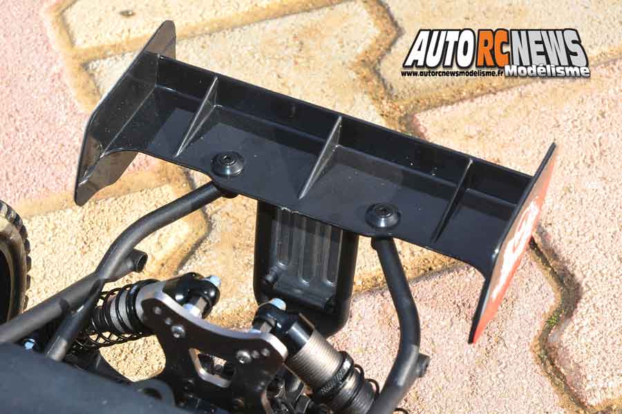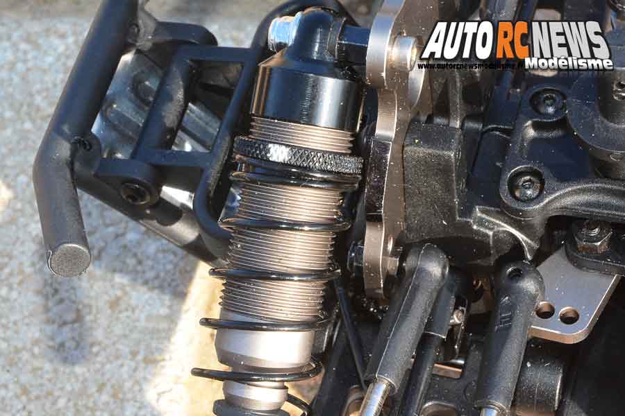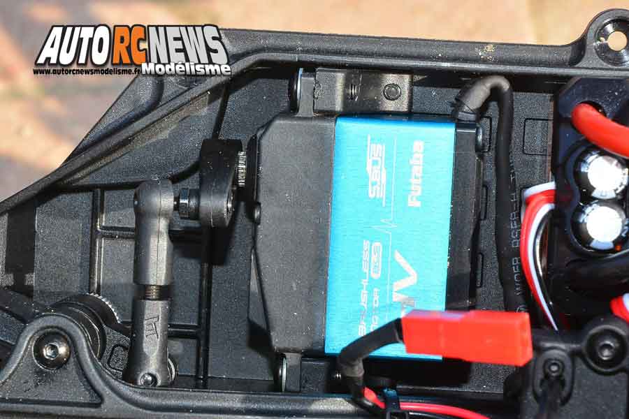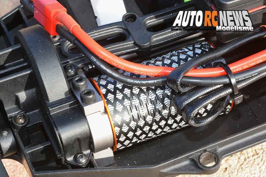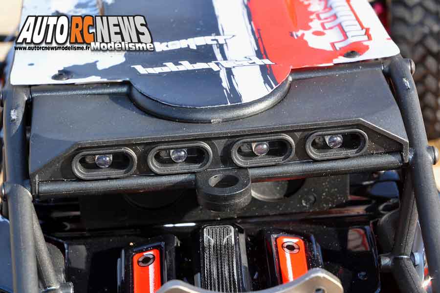 La voiture comprend également en série un servo Konect à pignons métal de 17 kilos de couple, annoncé pour 0,14 sec sur 60 degrés. Mécaniquement, les utilisateurs ne seront également pas déçus. L'auto campe sur des voies larges et possède des pneus à gros diamètre conçus pour pouvoir braver tous les types de surfaces. Sa suspension se pare de véritables amortisseurs hydrauliques réglables à corps aluminium et d'une transmission entièrement montée sur roulements à billes équipée de 3 différentiels à pignons coniques et de cardans articulés CVD en acier sur le train avant. Parmi les atouts recensés à bord du véhicule on remarquera également la présence de supports de suspension en aluminium réglables ainsi que celle des barres antiroulis au niveau des deux essieux. A noter aussi que des porte fusées avant-arrière et étriers avant en aluminium anodisé pourront être montés sur l'auto en option. Les fans de réglages verront la mise au point du châssis facilitée par des biellettes munies de pas inversés. Enfin, un aspect plus fun du véhicule séduira les plus jeunes utilisateurs. Il s'agit cette fois des deux rampes de phares à Led qui surplombent les deux cellules avant et arrière. Pratique pour rouler à la tombée de la nuit !