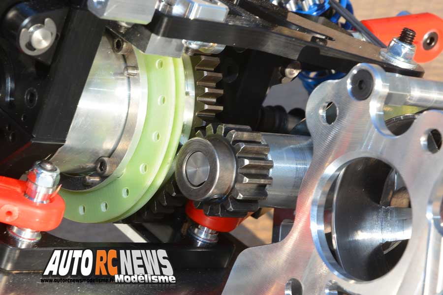 Le support d'arbre intermédiaire est constitué de cette superbe pièce usinée dans de l'aluminium 7075. Il est monté sur excentriques pour un réglage plus rapide de l'entre-dents entre la couronne nylon et le pignon moteur. Nous apercevons aussi la cloche d'embrayage qui est allégée.