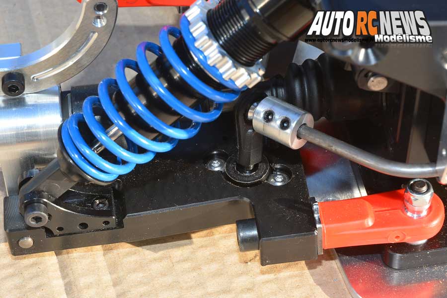 Chaque demi train arrière est formé d'un triangle et de deux rotules rouges qui permettent d'ajuster la largeur de la voie et le pincement des roues.