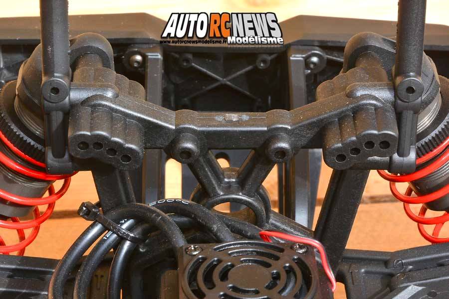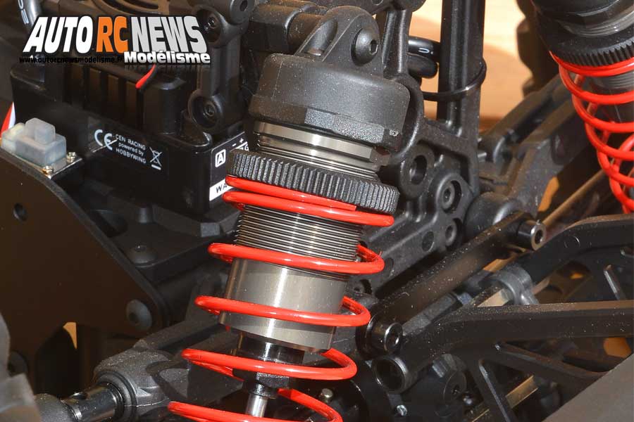 Ils reprennent une géométrie globalement identique sur les deux essieux. Ce qui nous vaut de nous retrouver en présence d'une double triangulation à l'avant et à l'arrière. Avec des bras supérieurs équipés de pas inversés de 8mm de diamètre pour régler le carrossage des roues, puis des triangles inférieurs massifs pourvus de 4 positions pour recevoir les amortisseurs. Côté cellule, les triangles disposent de fixations renforcées constituées par des axes lisses filetés à leur extrémités de 4 mm de diamètre. Les cellules sont dominées par deux supports amortisseurs identiques qui proposent 4 fixations pour ancrer les amortisseurs. Ces derniers ne font pas non plus dans la demi mesure. Il demeurent dans la lignée des caractéristiques de folie de l'engin, avec des corps big bore anodisés et traités qui affichent un diamètre de 25 mm. Prévoir un gros flacon pour les remplissages ultérieurs à venir ! Ces éléments de suspension possèdent des molettes filetées pour ajuster la tension de leurs ressorts respectifs, ainsi que des tiges en acier traité de 4 mm de diamètre. La cellule avant intègre aussi un save servo réglable en dureté et reste tributaire d'un servo à pignons métal de 7 kilos de couple. Toute cette mécanique demeurant solidaire de son châssis, constitué de deux plaques parallèles allégées (DVP) de 3 mm d'épaisseur.