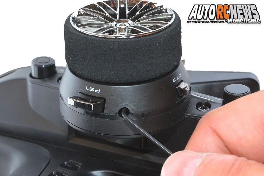 Elle met en évidence un nouvel écran LCD encore plus grand et donc lisible de 4,3 pouces. Celui-ci dispose de tous les réglages possibles en matière d'éclairage et de rétro éclairage, et au passage, celui-ci est devenu tactile. Tous les défilements successifs dans les fonctions de la radio s'effectueront donc désormais d'un simple toucher d'index comme sur votre smartphone ! D'où la disparition pure et simple de l'ancien Paddle multidirectionnel que l'on retrouvait sur les anciens boîtiers haut de gamme de la marque. En revanche, comme antérieurement à bord de la 4PX, 2 boutons veillent à la mise en route de la radio sous l'écran principal. Celui de gauche estampillé des 3 lettres DSP n'est autre qu'un Display. Autrement dit, dans ces conditions, l'émetteur n'émet aucun signal mais il permet quand même d'effectuer tous les réglages souhaités. Celui de droite frappé des 3 lettres PWR caractérise le mode de mise en route normal de la radio. La radio dispose d'une antenne escamotable parfaitement intégrée au sein de l'ergonomie générale du boîtier. Si l'on place l'antenne en question à la verticale comme pour se servir de la radio, une trappe donne accès à un logement qui permet d'insérer une carte micro SD disponible en option afin de pouvoir mettre à jour les logiciels ou pour copier les données de l'émetteur en vue d'un transfert vers une radio du même type. Les mises à jour pouvant aussi s'effectuer via un smartphone équipé du système Android. La façade principale nous place sinon en présence d'un volant multi branches parfaitement centré. Ce dernier est bien entendu réglable en dureté. Mais il est également permutable pour les gauchers. Quelques vis à manipuler et un câble à ôter et le tour sera joué ! 4 trims poussoirs classiques viennent le ceinturer. Un 5ème trim situé tout en bas du volant fait son apparition. Il s'agit d'un trim supplémentaire auquel vous pourrez affecter la fonction de votre choix. Le bas de la crosse argenté gravé des lettres Futaba identifie dans le même genre un switch poussoir auquel on peut affecter la fonction de son choix via la programmation. Enfin, dernière bonne nouvelle, cette Futaba 7PX est ajustable dans la langue Française. Ou dans les 7 autres langues disponibles !