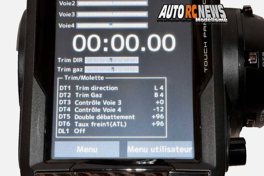 Toujours sur l'écran d'accueil, la partie inférieure possède quelques rappels des valeurs des trims. Deux mentions Menu et Menu utilisateur servent à rentrer dans les fonctions de manière tactile.
