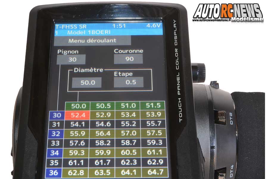 La mention Menu déroulant permet de calculer le ratio de transmission idéal en rentrant des paramètres tels que le diamètre des pneus et le nombre de dents du pignon moteur et de la couronne de l'auto utilisée.