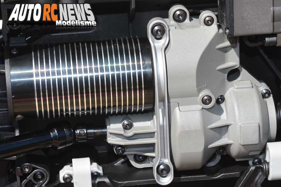 Le " booster " de ce châssis n'est autre qu'un moteur brushless 4 pôles sans capteur de 2200 kV. Celui-ci est monté sur un support réglable métallique. Il mesure 75,5 mm de long sur 41,8 mm de diamètre. Il fait appel à des connecteurs Traxxas, et sa cage intègre de nombreuses ailettes qui garantissent un bon refroidissement en fonctionnement. Et à titre indicatif, sachez aussi que ce moteur reçoit un pignon interchangeable en acier de 27 dents en sortie.