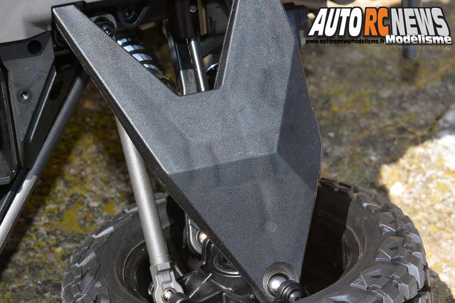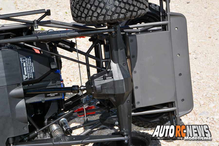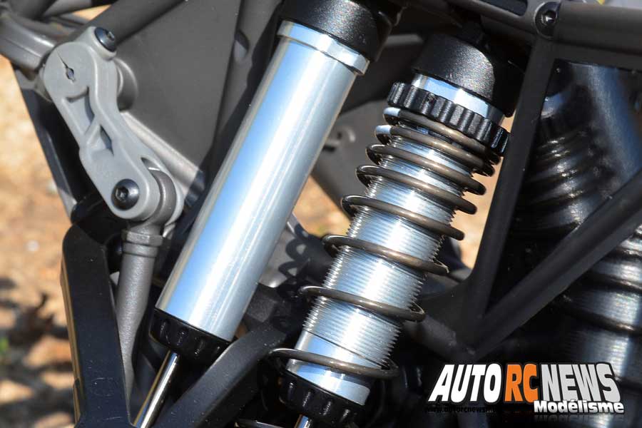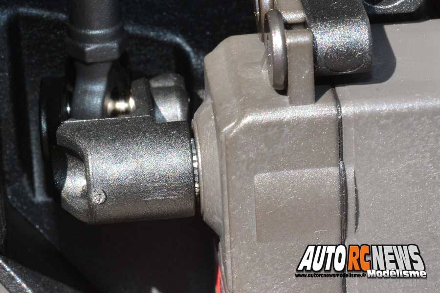 Il reprend une épure à double triangulation qui comprend des triangles en partie creux sur la partie supérieure pour laisser le passage à l'un des amortisseurs de la suspension, puis des triangles inférieurs pleins, massifs, qui brillent par leur épaisseur. Ces bras sont rattachés à des fusées montées sur rotules et sont reliés au différentiel de la cellule par des cardans articulés en acier de type CVD. La cellule est donc pourvue d'un différentiel à pignons coniques à 4 satellites. Tout le couple de transmission est en acier traité de haute qualité. La suspension se pare quant à elle de 2 amortisseurs par roue, répondant à l'appellation amortisseurs GTR chez Traxxas ! Le diamètre de leurs corps est somme toute relativement standard. Mais dans la mesure où les corps en question sont particulièrement longs et qu'ils contiennent un maximum d'huile, on peut sans problème leur attribuer le label Big Bore. Ils mesurent 134 millimètres et présentent pour particularité de jouer sur un effet bi-densité. Autrement dit, l'un des amortisseurs agit de manière classique avec la fonction hydraulique et le ressort de rappel réglable via une molette. Le second amortisseur fait abstraction de tout ressort. Il vient seconder le 1er, uniquement par l'hydraulique. Le tout conférant à l'ensemble une suspension onctueuse à souhait et dotée de pas loin de 9 centimètres de débattement en position maxi. Le tour d'horizon du train avant se termine par la présence d'une barre antiroulis à leviers qui se révèle efficace. Du moins en statique. En marge de cela, soulignons aussi la présence des disques de frein ventilés accompagnés d'étriers factices qui ont été greffés en sortie de fusées. Mais c'est juste pour faire joli !