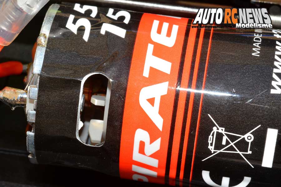 Le Pirate Dune Scraper reçoit un moteur brushed de type 550 à cage ventilée. Ce moteur est positionné sur un support réglable tout d'aluminium vêtu. Il possède un pignon démontable en acier en sortie. Un variateur étanche de 40 Ampères se joint à l'ensemble. Celui-ci est entièrement pré programmé d'usine. Une précision toutefois, ce variateur comporte 2 cavaliers dont on peut modifier la position. L'un d'eux est directement lié au type d'accus que l'on va utiliser avec l'auto. D'origine, celui-ci est placé à gauche, car l'auto est fournie avec un accu Ni-Mh. Si par la suite vous décidez d'utiliser un accu Li-Po, vous devrez déplacer le cavalier en le plaçant à droite pour assurer la parfaite compatibilité de tout l'ensemble.