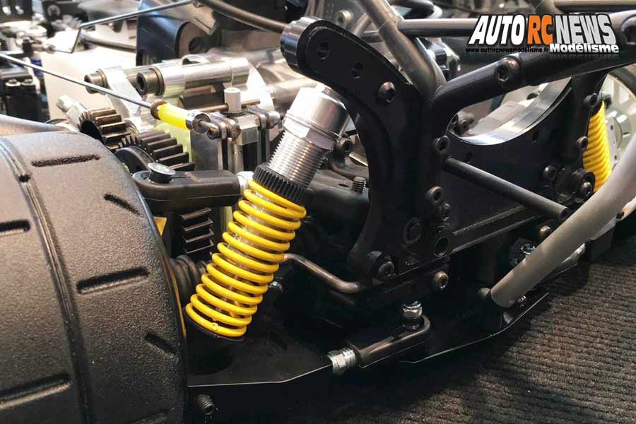Le train avant comporte de nouveaux porte fusées usinés en aluminium. Notez aussi la fixation inférieure des amortisseurs qui s'effectue via des poussoirs et la barre antiroulis du genre costaud.