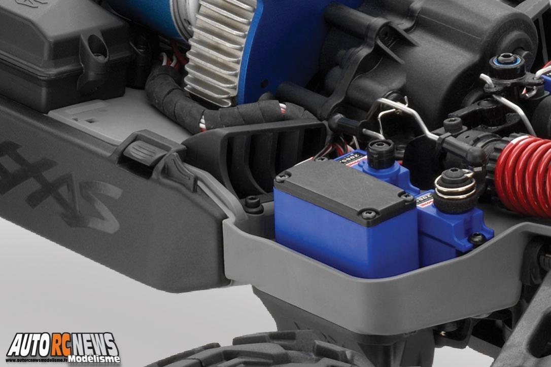 Cette auto est propulsée par un moteur à charbons sertis Titan 775 accouplé à un variateur Traxxas EVX-2 étanche pouvant tolérer jusqu'à 16,8 volts au niveau de l'alimentation. Le fabricant la propose avec une radio à volant en 2,4 Ghz équipée de deux servos numériques étanches de 9 kilos de couple chacun, placés à la direction.